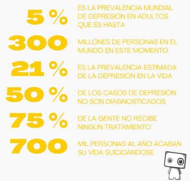 A nivel mundial, se calcula que un 3,8 % de la población sufre depresión. Entre los adultos, la cifra alcanza al 5 % (4 % en hombres y 6 % en mujeres), y en los mayores de 60 años asciende al 5,7 %. En total, alrededor de 280 millones de personas padecen esta condición. Se sabe también que la depresión es un 50 % más frecuente en mujeres que en hombres y que más del 10 % de las mujeres embarazadas o en el posparto atraviesan un episodio depresivo. Cada año, más de 700.000 personas mueren por suicidio, siendo esta la cuarta causa principal de fallecimiento en jóvenes de entre 15 y 29 años.